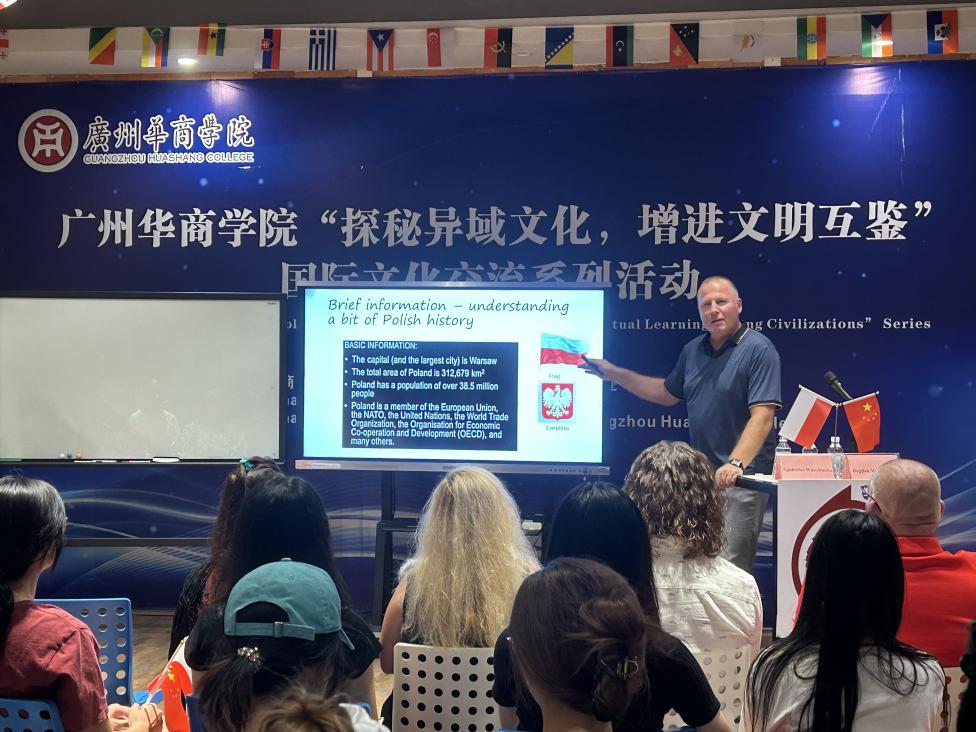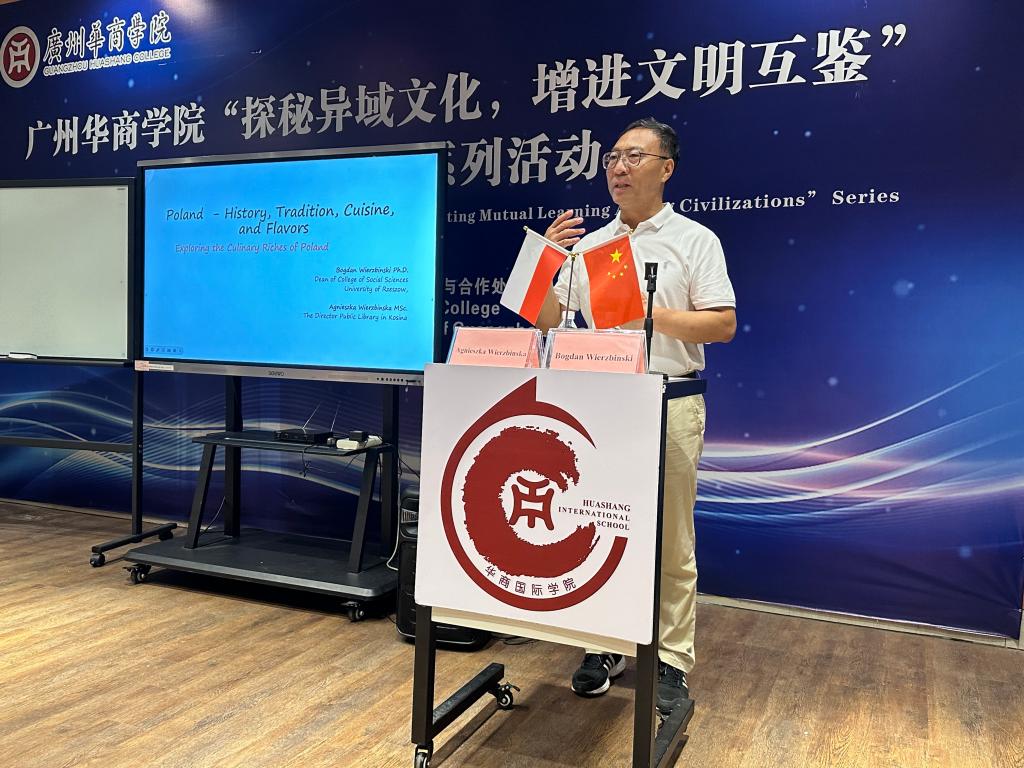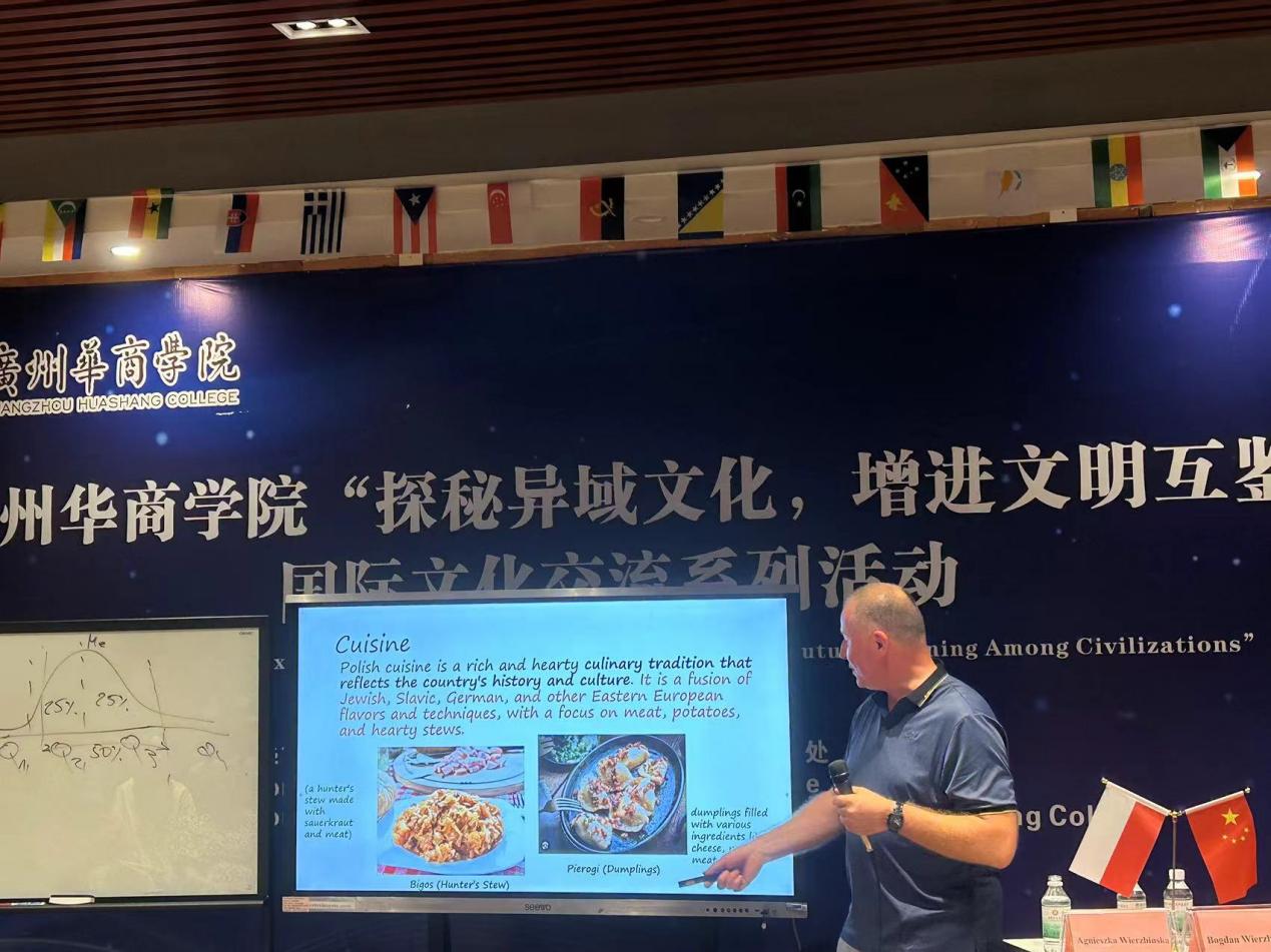 To further broaden university students' international perspectives and enrich the multicultural atmosphere on campus, following the successful organization of eight sessions of the "Exploring Foreign Cultures, Promoting Mutual Learning Among Civilizations" international cultural exchange series, the ninth session—the Polish Culture Sharing Session—was held on September 3, 2024. The keynote speakers for this event were Dr. Bogdan Wierzbinski, Dean of the Faculty of Social Sciences at the University of Rzeszów, Poland, and his wife, Ms. Agnieszka Wierzbinska. Attendees included Wang Wenzhong, Director of the Office of International Exchange and Cooperation; Hui Yanyan, Dean of the International School; Fu Zhigang, Visiting Professor from the University of Rzeszów; Yang Lijun, Secretary of the International School's Party Branch; Dr. Aneela Qadir, a Pakistani faculty member; John Jung, an American faculty member; Begum Firinci, a Turkish faculty member; Joshua Cachin, a Filipino faculty member; and over 60 students from the School of Data Science, School of Humanities, School of Health Medicine, School of Artificial Intelligence, School of Communication and Media, and the International School. Together, they immersed themselves in the charm of Polish culture. The session was hosted by Director Wang Wenzhong.