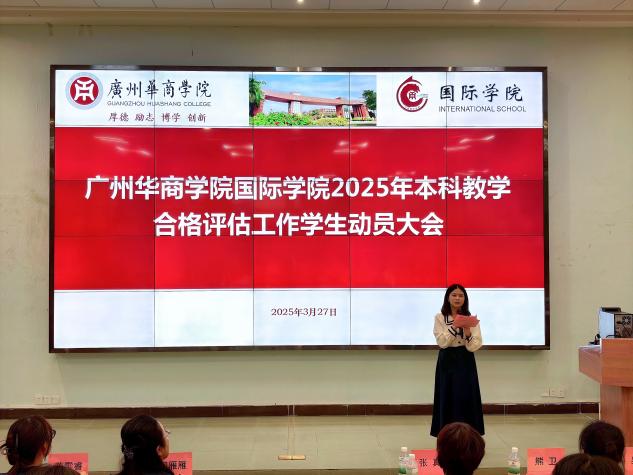 为全力迎接学校本科教学合格评估,2025年3月27日下午,广州华商学院国际学院在励志楼C408召开了2025年本科教学合格评估学生动员大会。国际学院院长回雁雁、副院长张真、学工办主任关慧慧、学院团委书记郝自秀、各班级班主任及百余名学生代表共同参会。会议由学工办主任关慧慧主持。
