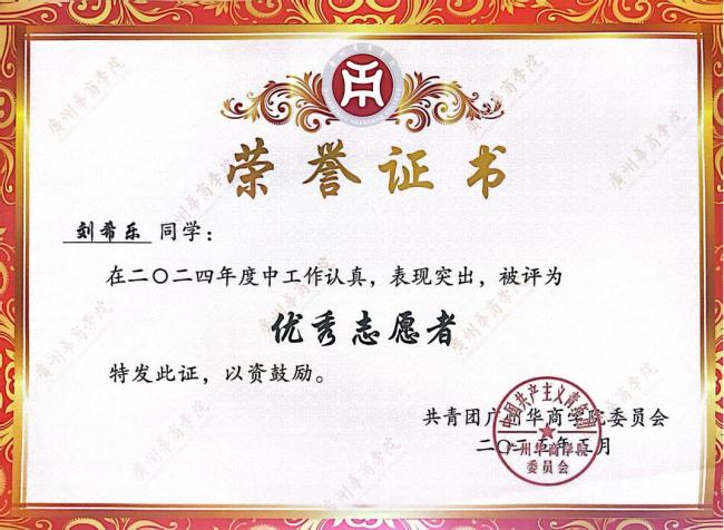 刘希乐,共青团员,曾担任2023-2024学年担任校青年志愿者协会社会志愿服务部工作人员、2023-2024学年校园通讯社暨易班工作总站行政监管部门工作人员、2024-2025学年担任国际学院青协分会负责人;现担任国际学院学生会主席团成员,班级学习委员。