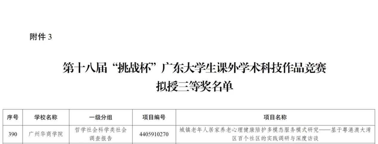 2025年4月30日,第十八届“挑战杯”广东大学生课外学术科技作品竞赛揭晓终审决赛入围及获奖名单,由国际学院院长回雁雁教授与学工办主任关慧慧老师指导的跨学院团队,凭借《城镇老年人居家养老心理健康陪护多模态服务模式研究——基于粤港澳大湾区百个社区的实践调研与深度访谈》项目,荣获省赛三等奖!这是我院在教育部榜单项目中的首次突破!